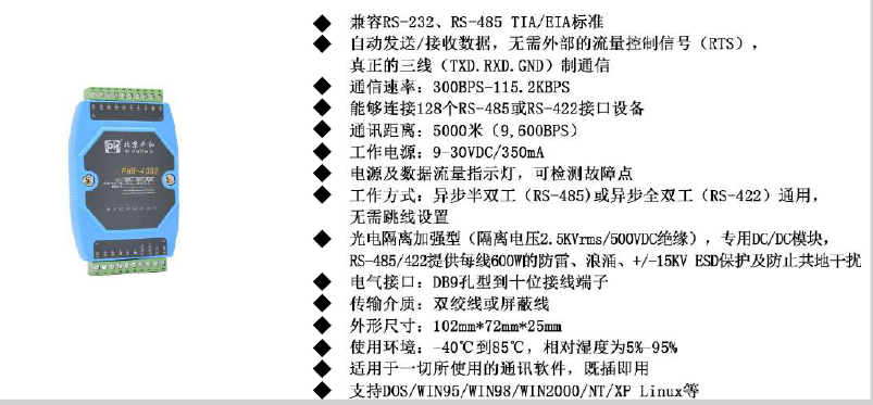 | 工作方式 | 異步半雙工(RS- 485)或異步全雙工(RS-422)通用,無需跳線設(shè)置 |
