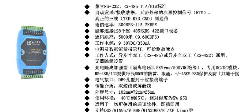 | 工作方式 | 異步半雙工(RS-485)或異步全雙工(RS-422)通用,無需跳線設置 |