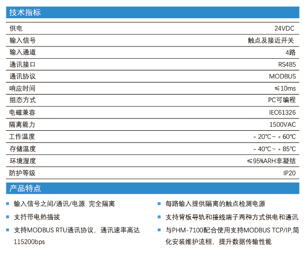 將工業(yè)現(xiàn)場的4路開關(guān)量分別隔離轉(zhuǎn)換為數(shù)字信號,按照MODBUS規(guī)約,通過RS485通訊方式,將數(shù)字信號提供給PHM-7100,PLC或上位機等控制器或數(shù)據(jù)采集系統(tǒng)。完善的隔離設(shè)計理念非常適合工業(yè)現(xiàn)場的復(fù)雜工況,長期穩(wěn)定性好,每路提供隔離的觸點檢測電源,增加了觸點檢測的可靠性、抗干擾性能優(yōu)異。