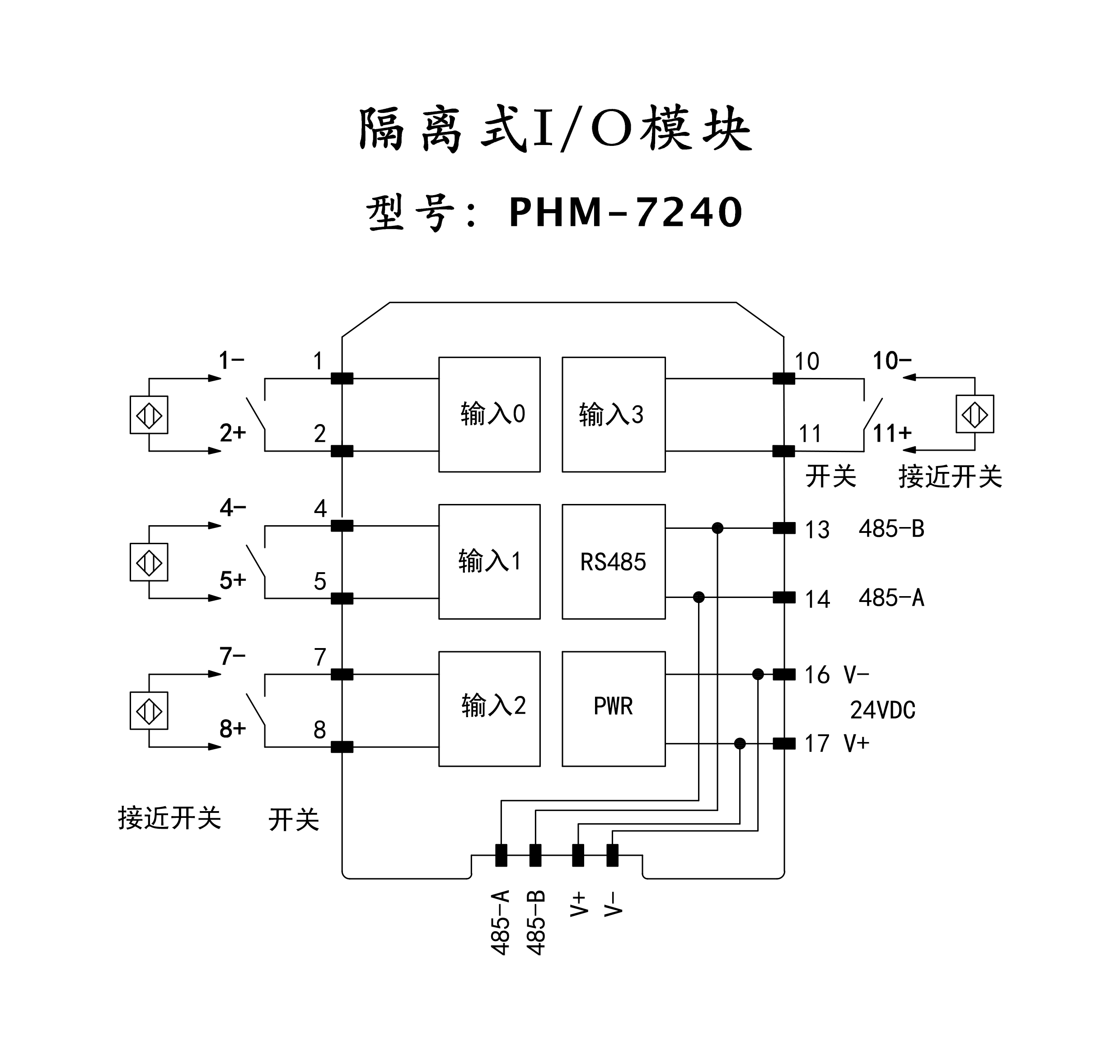 將工業(yè)現(xiàn)場的4路開關(guān)量分別隔離轉(zhuǎn)換為數(shù)字信號,按照MODBUS 規(guī)約,通過RS485通訊方式, 將數(shù)字信號提供給PHM-7100,PLC或上位機等控制器或數(shù)據(jù)采集系統(tǒng)。完善的隔離設(shè)計理念非常適合工業(yè)現(xiàn)場的復(fù)雜工況,長期穩(wěn)定性好,每路提供隔離的觸點檢測電源,增加了觸點檢測的可靠性、抗干擾性能優(yōu)異。