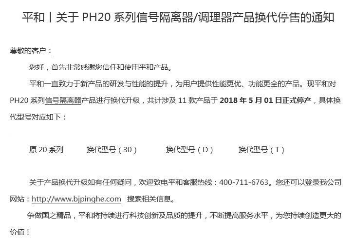 2018-04-16 信號隔離器,隔離器,安全柵平和丨關于PH20系列信號隔離器/調理器產品換代停售的通知