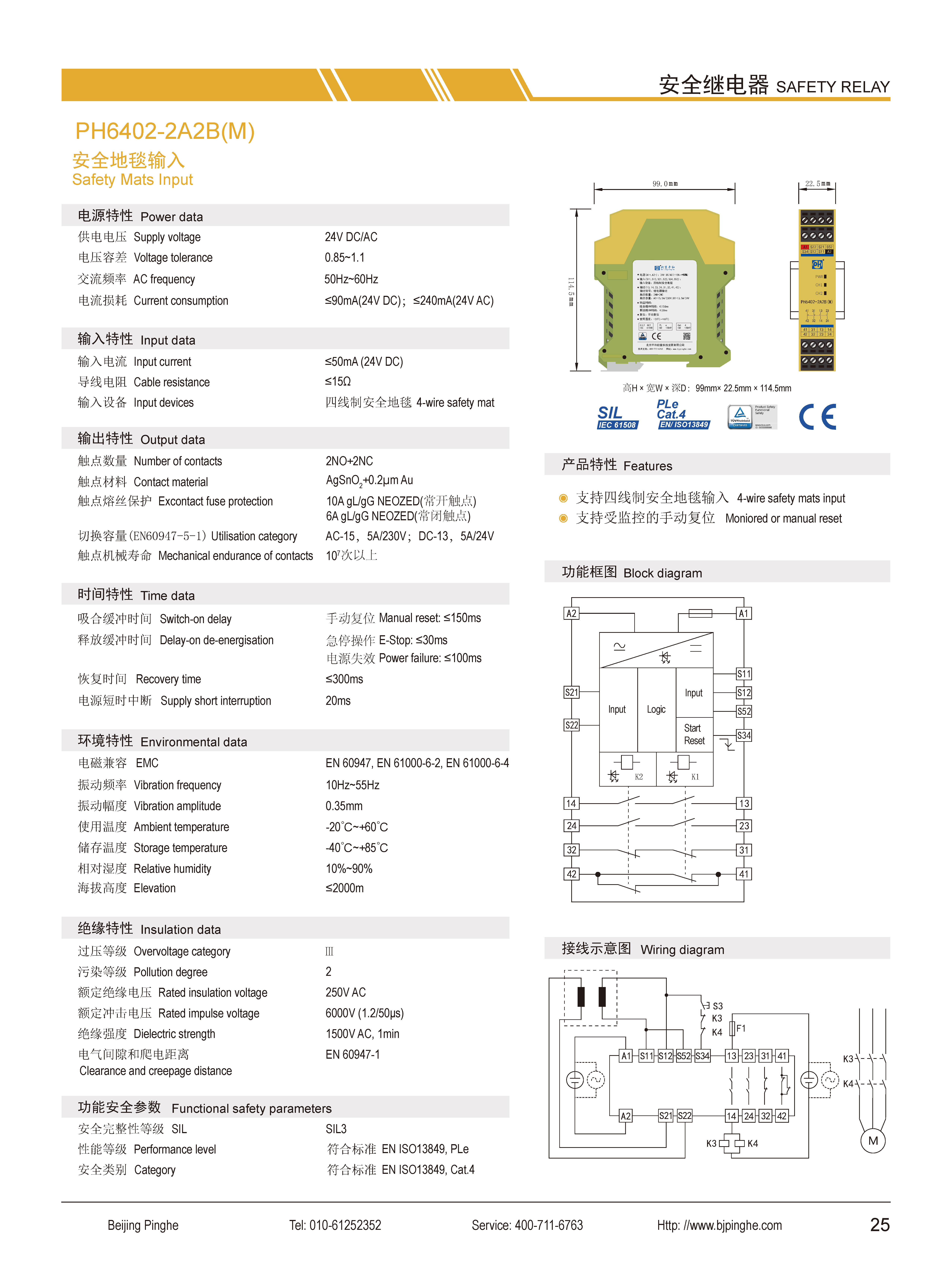 PH6402-2A2B(M)是一款安全繼電器控制模塊,適用于安全地毯輸入,具有2路常開(NO)安全輸出觸點(diǎn)和2路常閉(NC)輔助輸出觸點(diǎn)的安全繼電器。它支持雙通道操作,手動復(fù)位,并具有復(fù)位按鈕監(jiān)控功能。