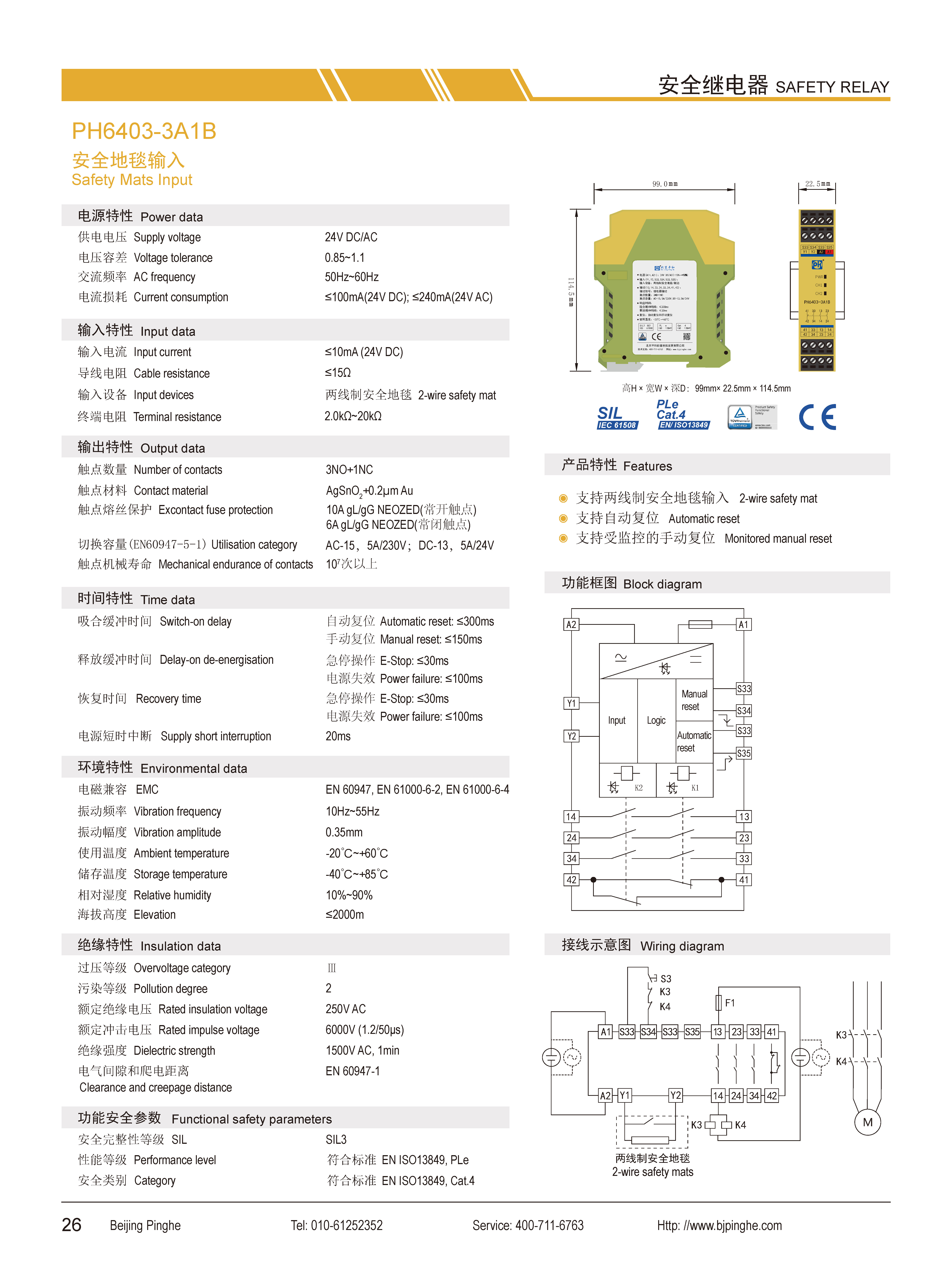 PH6403-3A1B是一款安全繼電器控制模塊,適用于兩線制安全地毯輸入,具有3路常開(NO)安全輸出觸點和1路常閉(NC)輔助輸出觸點的安全繼電器。它支持手動或自動復(fù)位,并具有復(fù)位按鈕監(jiān)控功能。