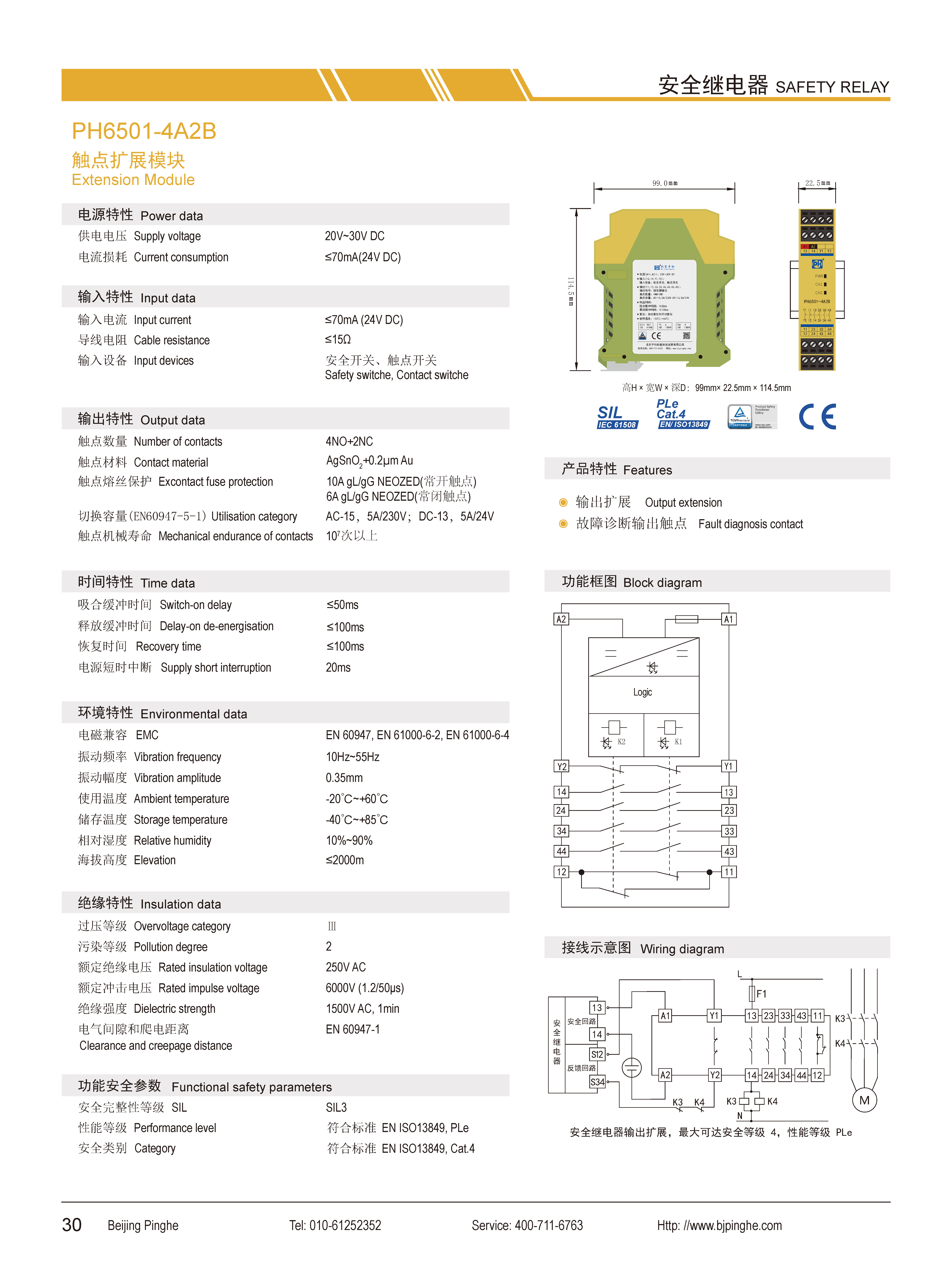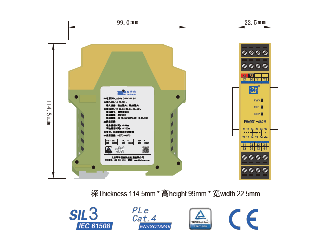 PH6501-4A2B是一款安全繼電器輸出擴展模塊,它接收現(xiàn)場的安全開關(guān)信號,并擴展為4路常開(NO)安全輸出觸點和2路常閉(NC)輔助輸出觸點,2路輔助觸點可分別用于輸出狀態(tài)指示及故障反饋。