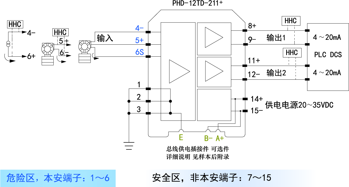 電涌保護(hù)型模擬量輸入隔離柵為危險(xiǎn)區(qū)域的二、三線制變送器提供隔離供電,變送器或電流源產(chǎn)生的4~20mA信號,從危險(xiǎn)區(qū)傳送到安全區(qū)輸出,從而驅(qū)動安全區(qū)域的負(fù)載。對于二、三線制變送器或電流源信號,該隔離柵支持疊加到4~20mA信號上的HART數(shù)字信號雙向通訊,并具有斷線報(bào)警功能。