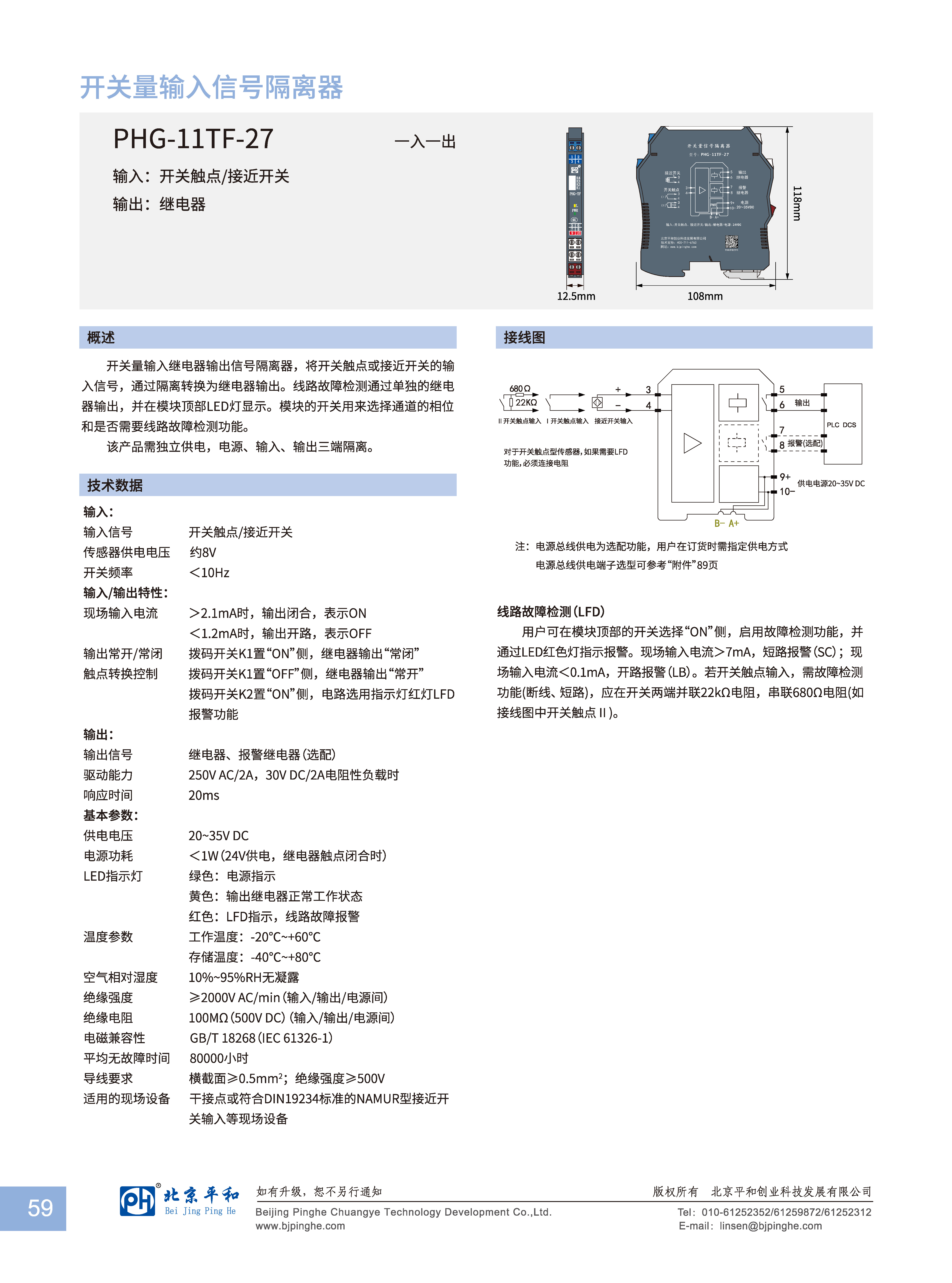 開關(guān)量輸入繼電器輸出信號隔離器, 將開關(guān)觸點(diǎn)或接近開關(guān)的輸入信號, 通過隔離轉(zhuǎn)換為繼電器輸出。線路故障檢測通過單獨(dú)的繼電器輸出,并在模塊頂部LED燈顯示。模塊的開關(guān)用來選擇通道的相位和是否需要線路故障檢測功能。