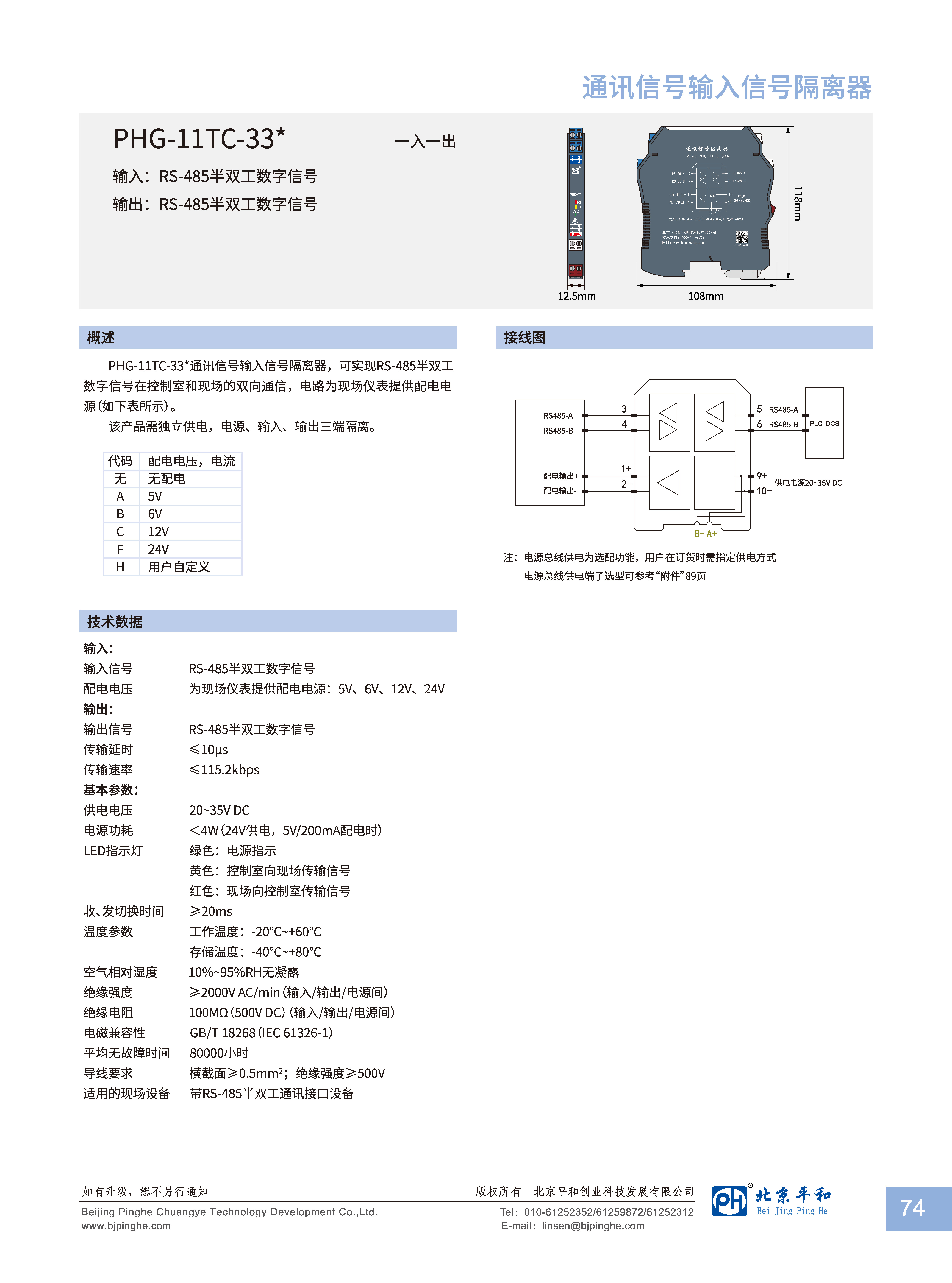 PHG-11TC-33*通訊信號輸入信號隔離器,可實現(xiàn)RS-485半雙工數(shù)字信號在控制室和現(xiàn)場的雙向通信,電路為現(xiàn)場儀表提供配電電源(如下表所示)。