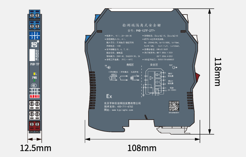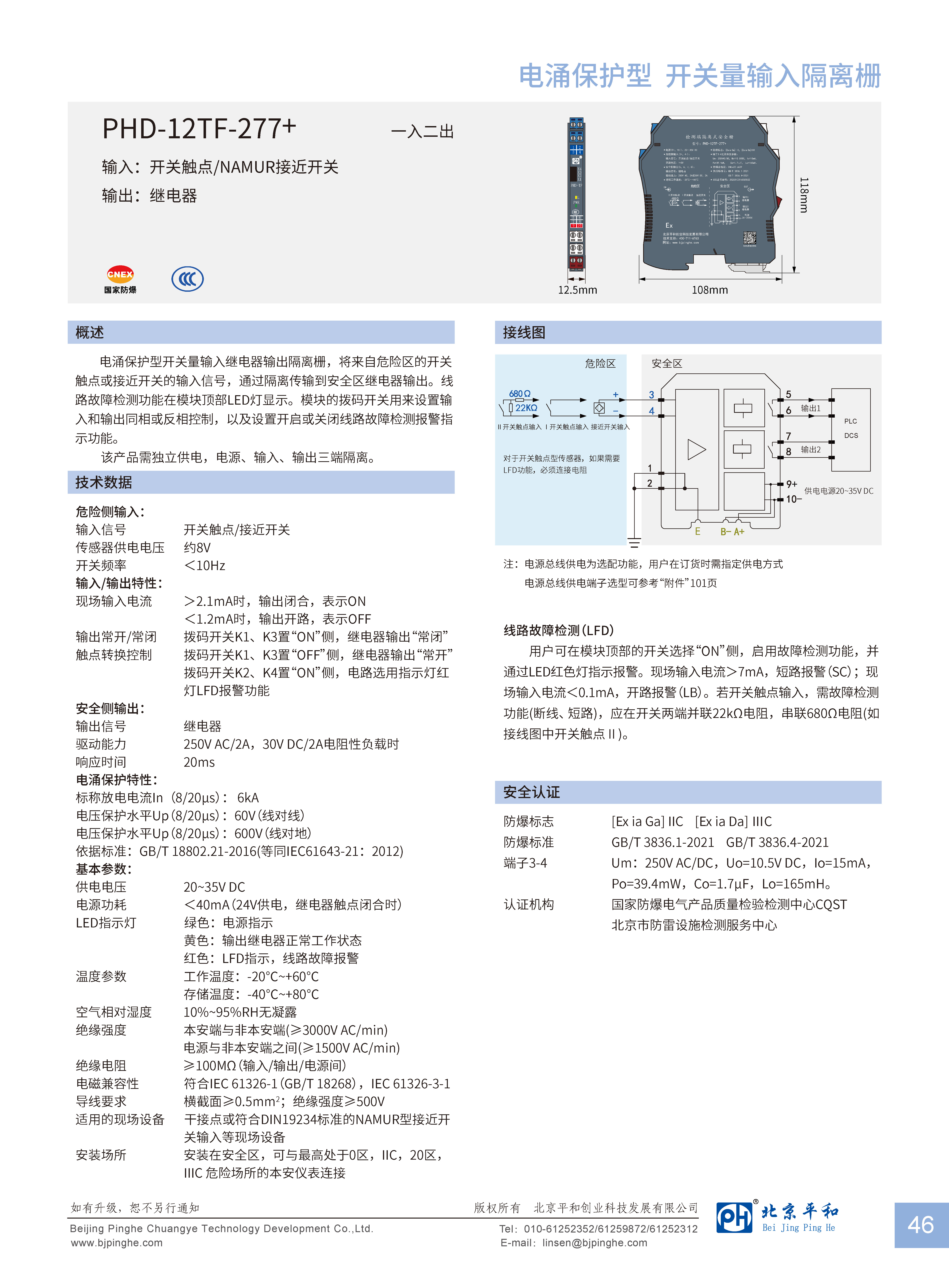 電涌保護型開關量輸入繼電器輸出隔離柵,將來自危險區(qū)的開關觸點或接近開關的輸入信號,通過隔離傳輸?shù)桨踩珔^(qū)繼電器輸出。線路故障檢測功能在模塊頂部LED燈顯示。模塊的撥碼開關用來設置輸入和輸出同相或反相控制,以及設置開啟或關閉線路故障檢測報警指示功能。