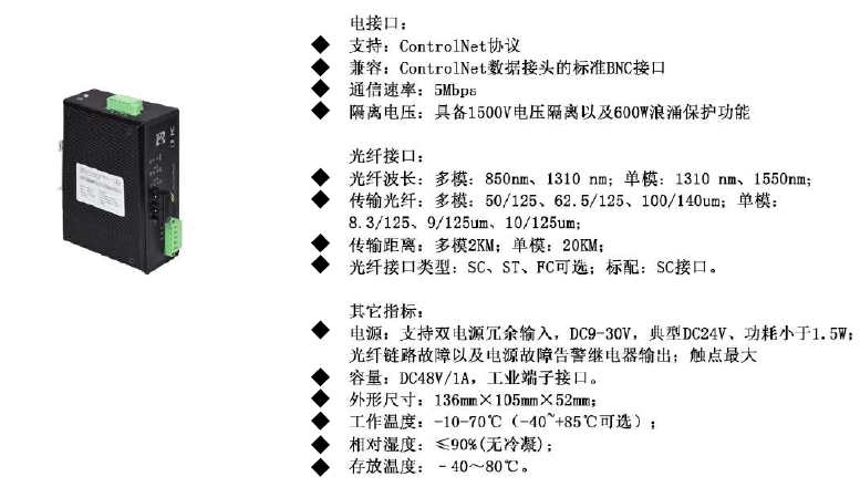 支持:ControlNet協(xié)議 兼容:ControlNet數據接頭的標準BNC接口 通信速率:5Mbps 隔離電壓:具備1500V電壓隔離以及600W浪涌保護功能 |