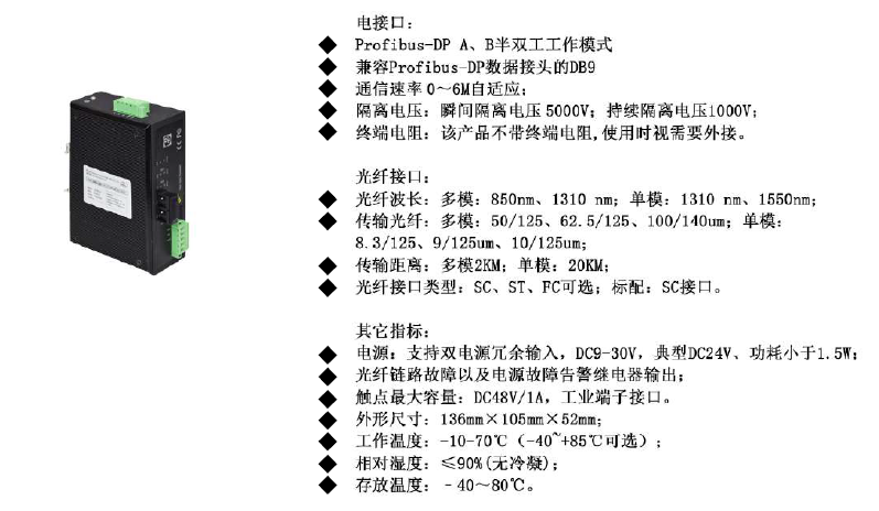 *支持Profibus-DP工業(yè)控制現(xiàn)場(chǎng)總線(xiàn)協(xié)議。通信速率(~6M自適應(yīng)。光纖最遠(yuǎn)通信距離可達(dá)60KM。