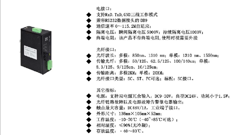 *支持RS-232工業(yè)控制現(xiàn)場總線協(xié)議。通信速率0~115.2M自適應(yīng)。*光纖最遠通信距離可達6OKM。