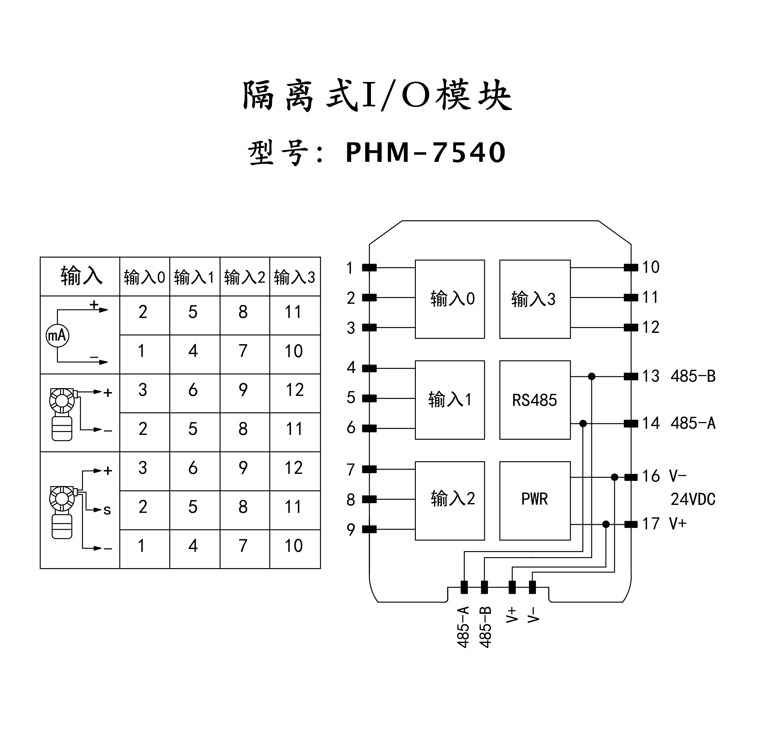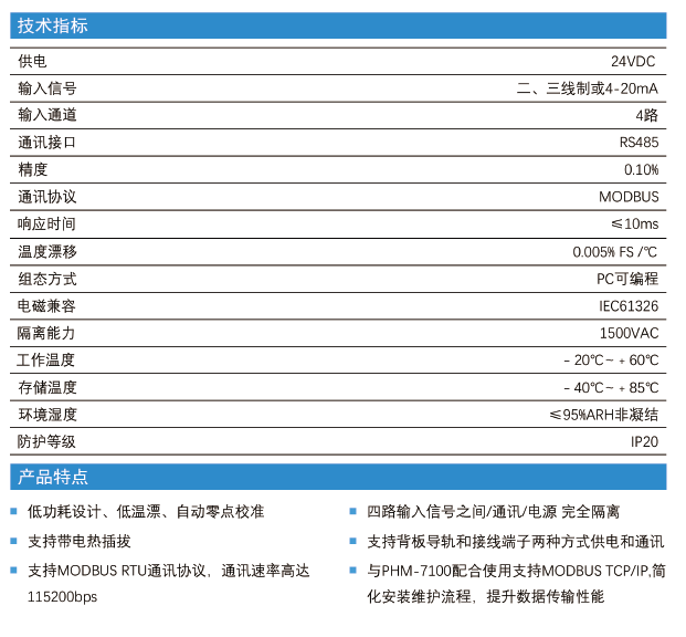 將工業(yè)現場的四路電流信號轉換為數字信號,按照MODBUS規(guī)約,通過RS485通訊方式,將數字信號提供給PHM-7100、PLC或上位機系統。