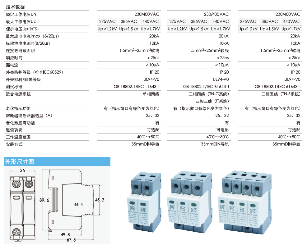 用第三級的電源浪涌保護器,適合安裝在各類供電電源的終端配電箱,以及其他LPZ2區(qū)與LPZ3區(qū)和后續(xù)分區(qū)的交界處。