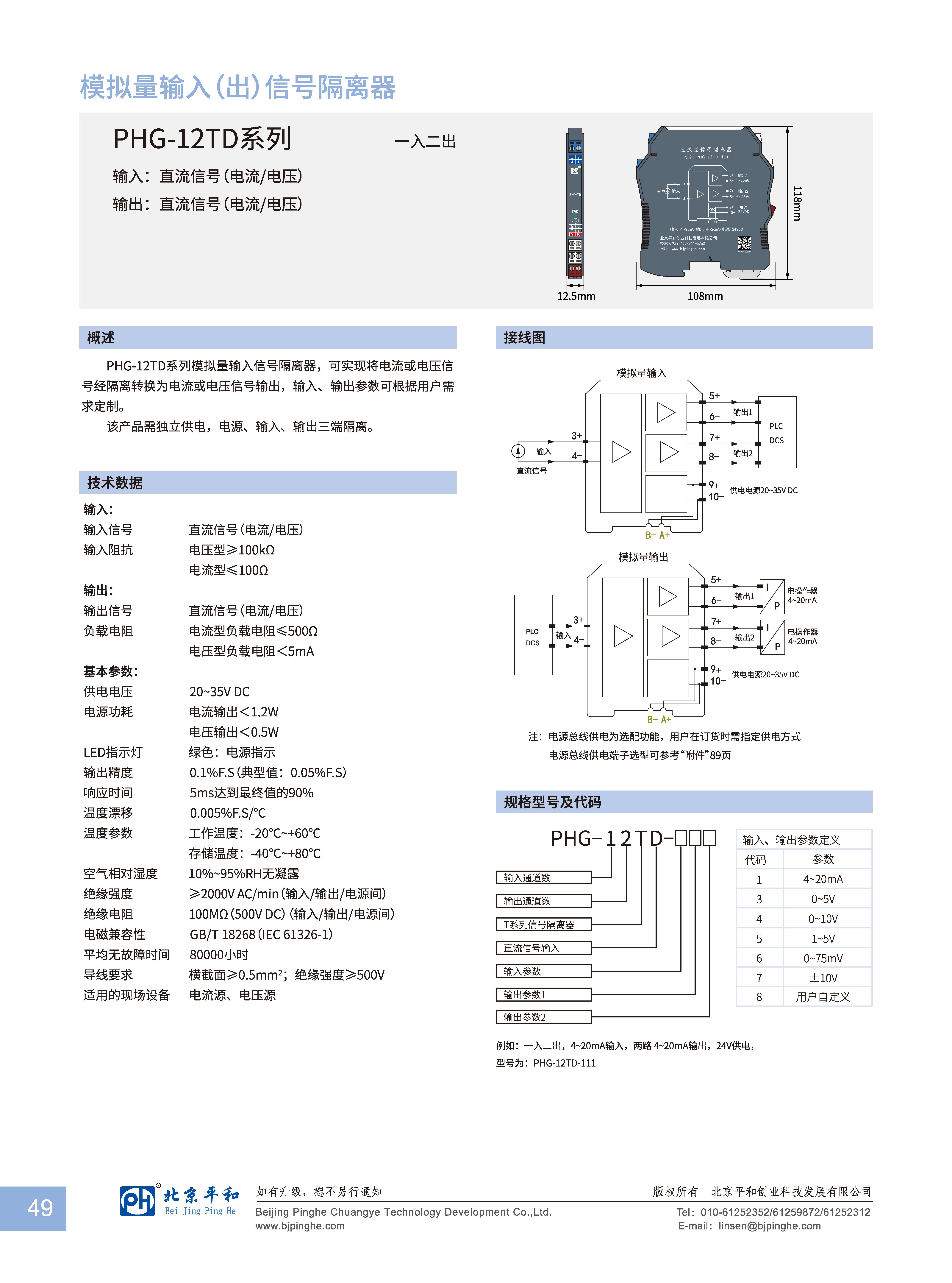 PHG-12TD系列模擬量輸入信號(hào)隔離器,可實(shí)現(xiàn)將電流或電壓信號(hào)經(jīng)隔離、轉(zhuǎn)換為電流或電壓信號(hào)輸出,輸入、輸出參數(shù)可根據(jù)用戶需求定制。