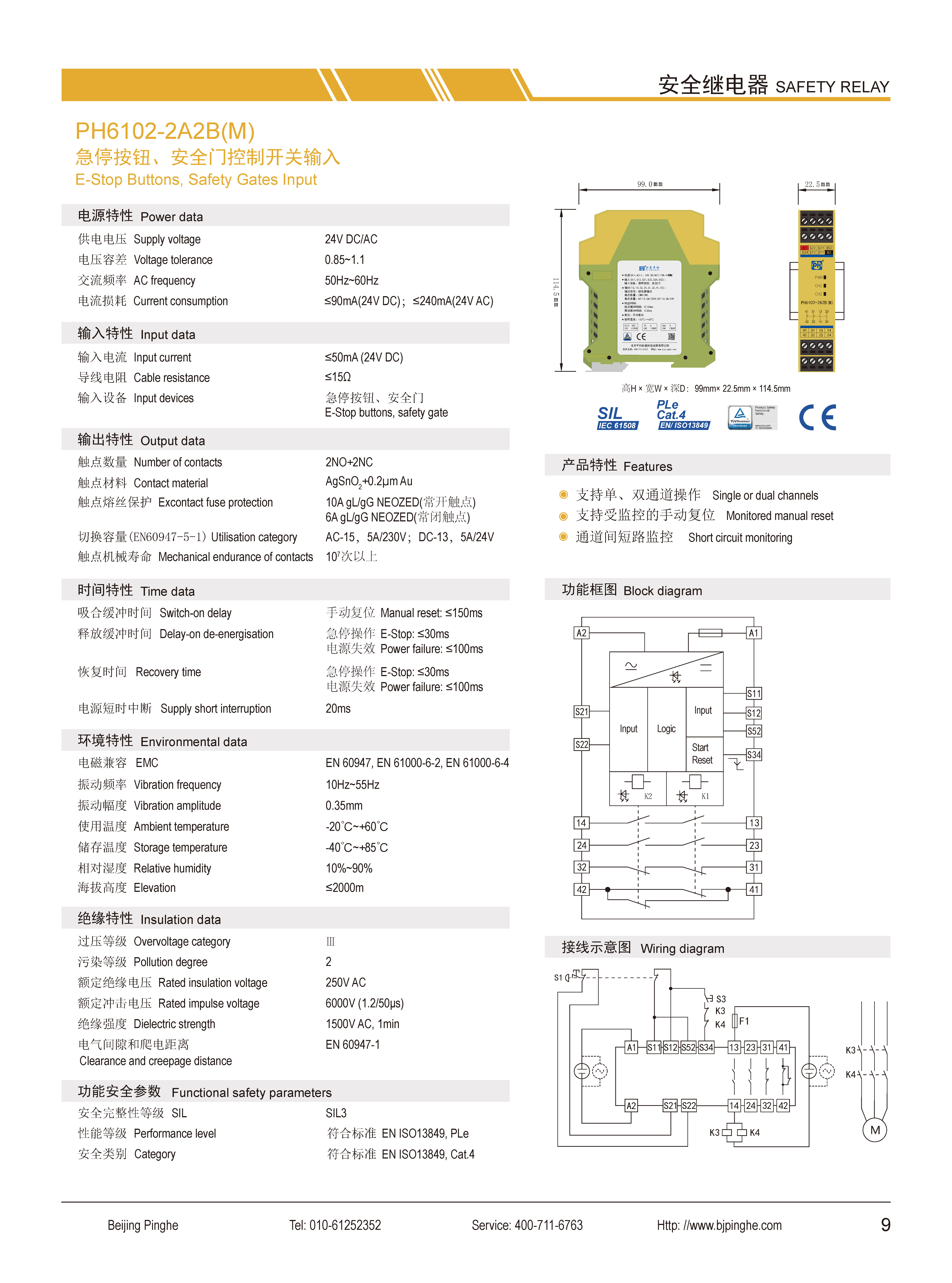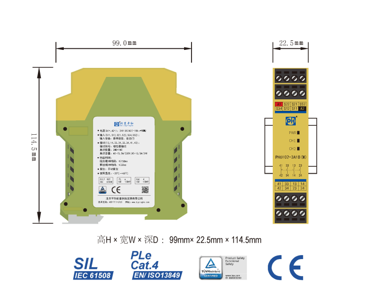 PH6102-3A1B(M)是一款安全繼電器控制模塊,適用于急停按鈕、安全門控制開關(guān)輸入,具有3路常開(NO)安全輸出觸點(diǎn)和1路常閉(NC)輔助輸出觸點(diǎn)的安全繼電器。它支持單、雙通道操作,手動(dòng)復(fù)位,并具有通道間短路監(jiān)控功能。