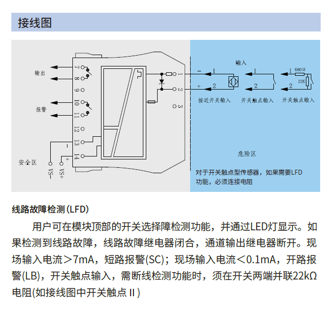 現(xiàn)場輸入電流>7mA,短路報警(SC),現(xiàn)場輸入電流<0.1mA,開路報警(LB)