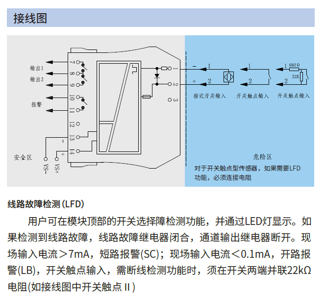 過安全柵隔離傳輸?shù)桨踩珔^(qū)繼電器輸出。線路故障檢測通過單獨的繼電器輸出(選配),并在