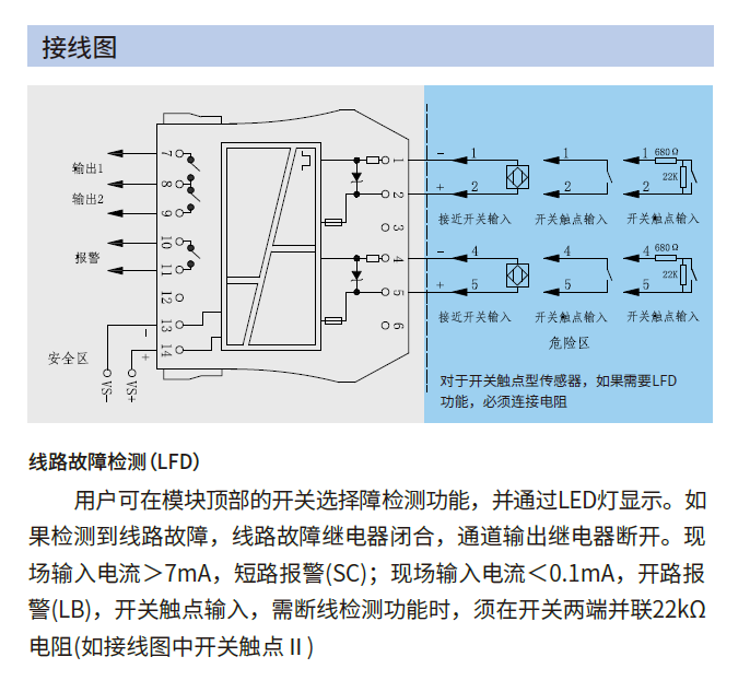 過安全柵隔離傳輸?shù)桨踩珔^(qū)繼電器輸出。線路故障檢測通過單獨(dú)的繼電器輸出(選配),并在