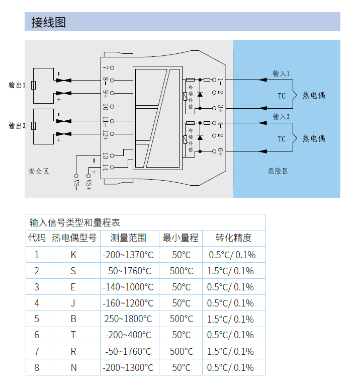 | 輸入信號(hào) | K、S、E、J、B、T、R、N熱電偶信號(hào) |
