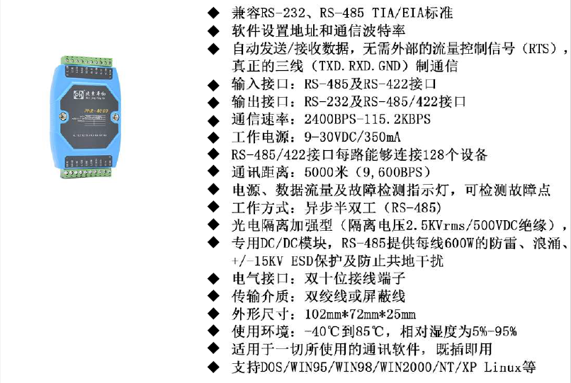 PH-S5209用來連接計算機系統(tǒng)和多個相同設(shè)備之間的通信,它內(nèi)部包含微處理器,每個PH-S5209可以設(shè)置一個獨立的地址,計算機可以通過PH-S5209單獨和某個設(shè)備進行通信,使用戶可以方便的構(gòu)建485/232網(wǎng)絡。