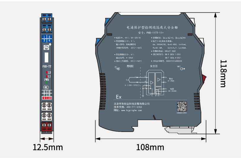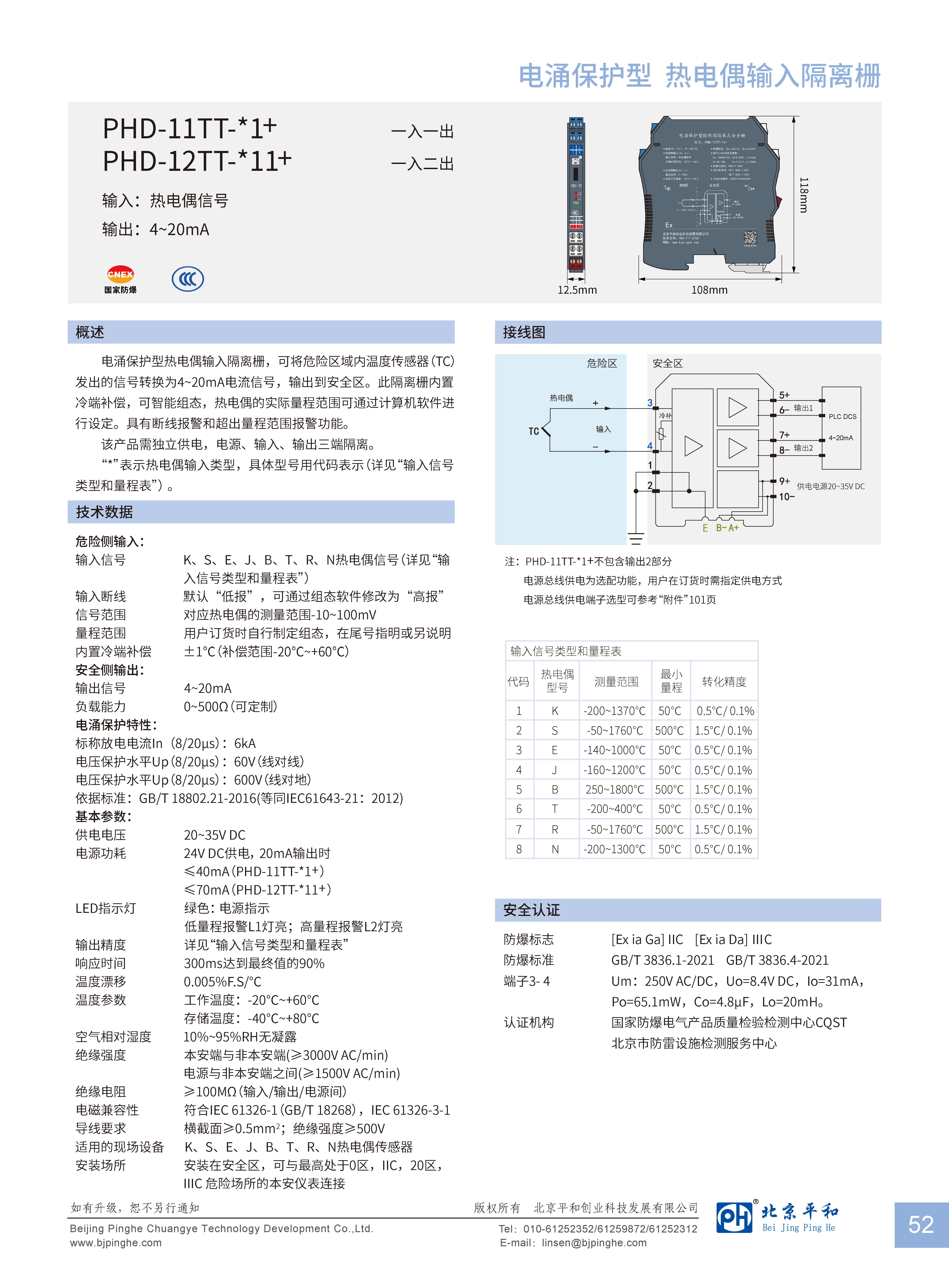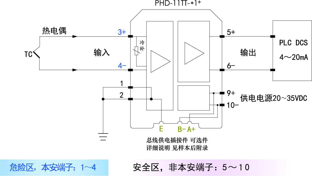 電涌保護型熱電偶輸入隔離柵,可將危險區(qū)域內(nèi)熱電偶(TC)信號隔離轉換為4-20mA電流信號,輸出到安全區(qū)。此隔離柵內(nèi)置冷端補償,可智能組態(tài),熱電偶的實際量程范圍可通過計算機軟件進行設定。具有斷線報警和超出量程范圍報警功能。