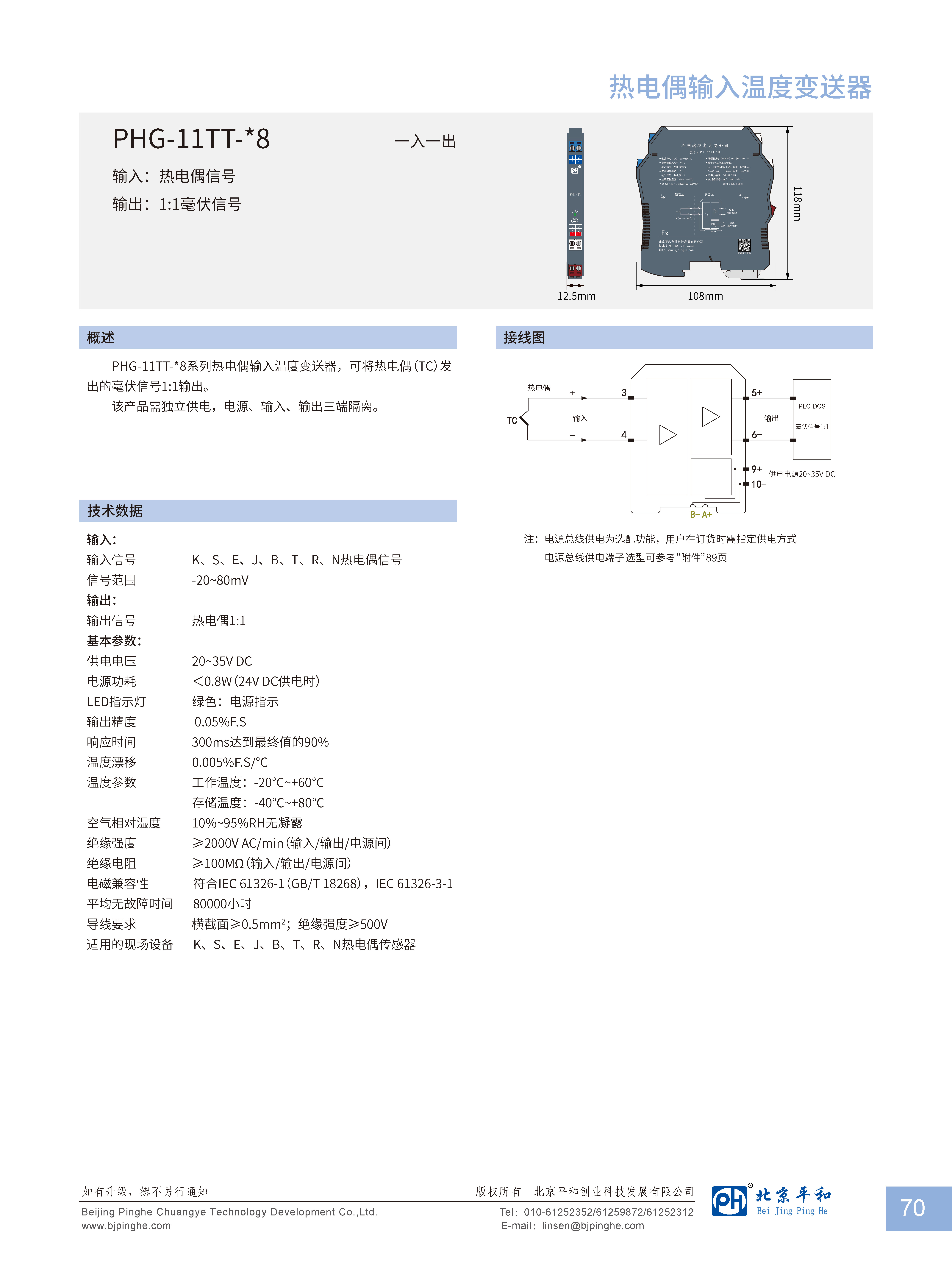 PHG-11TT-*8系列熱電偶輸入溫度變送器,可將熱電偶(TC)發(fā)出的毫伏信號(hào)1:1輸出。